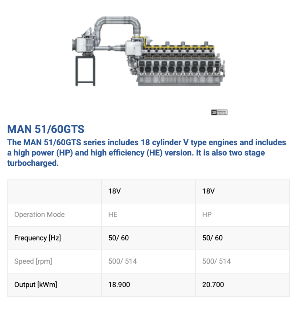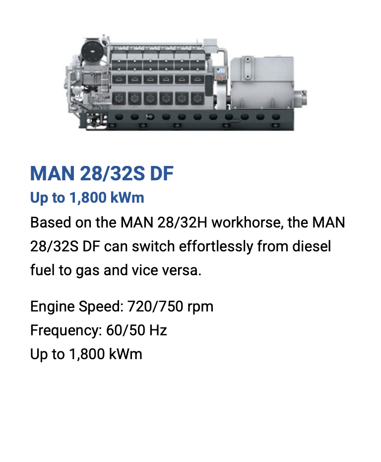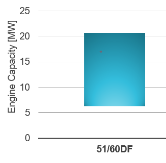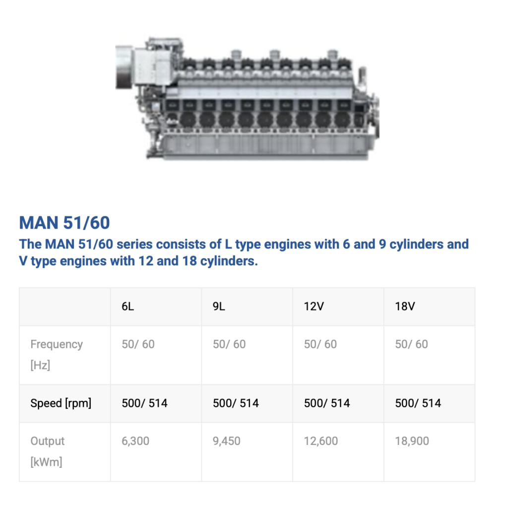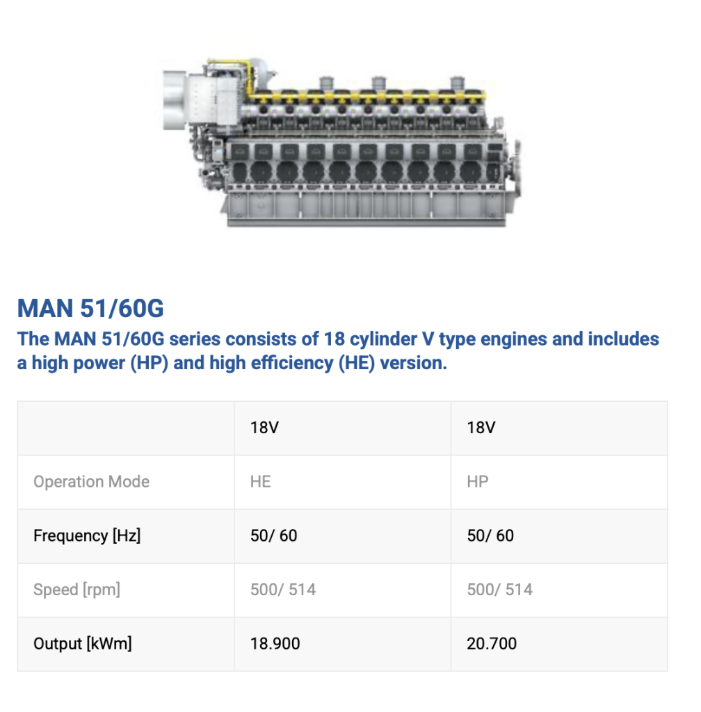 The MAN 51/60DF engines are designed for high reliability and exceptional performance in stationary power generation. They are optimized for high ambient temperatures and altitude making them ideal for a wide range of applications. These versatile engines support different fuel variants, allowing flexible operation according to specific needs. If one of the liquid fuel engines has already been purchased, it’s easy to upgrade them to dual fuel capability to meet changing needs. They offer the ability to start and stop in gas mode, increasing operating efficiency. Available in high efficiency and high power versions, the MAN 51/60DF engines ensure optimum performance in a wide range of applications. The engines are designed to be clean and their flexibility is further demonstrated by their full stand-by capability in both gas and liquid fuel operation.