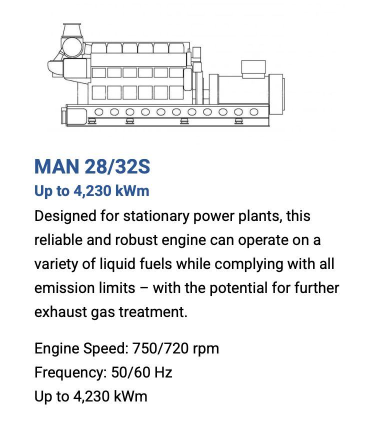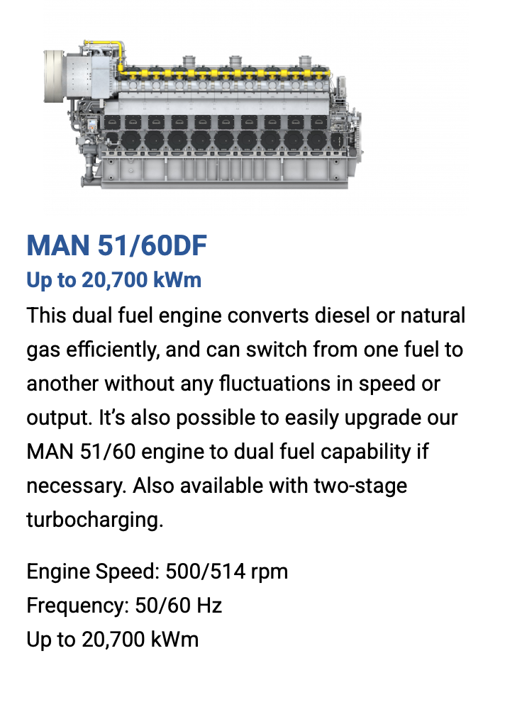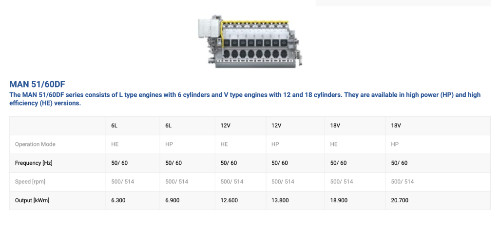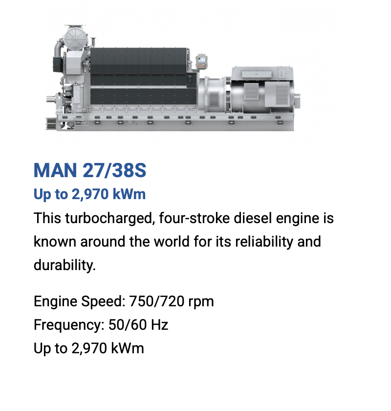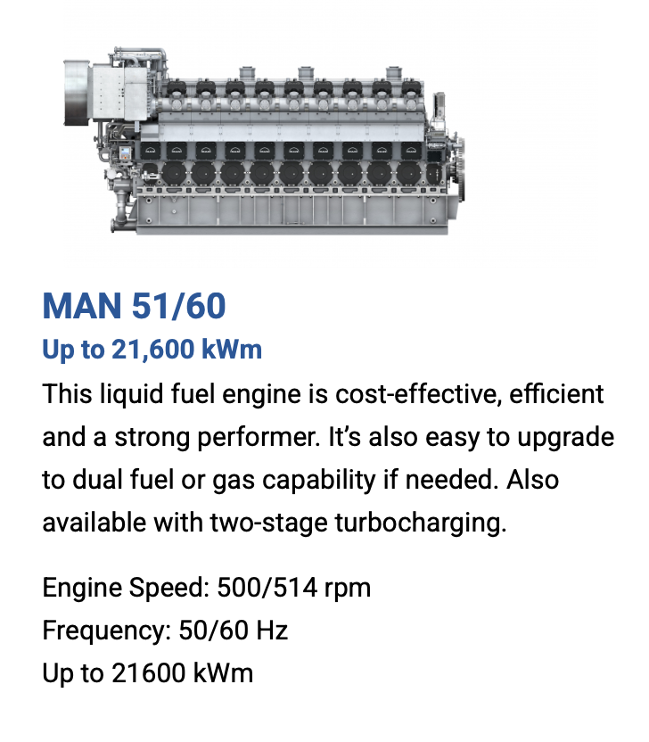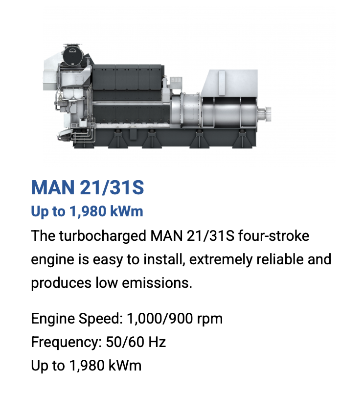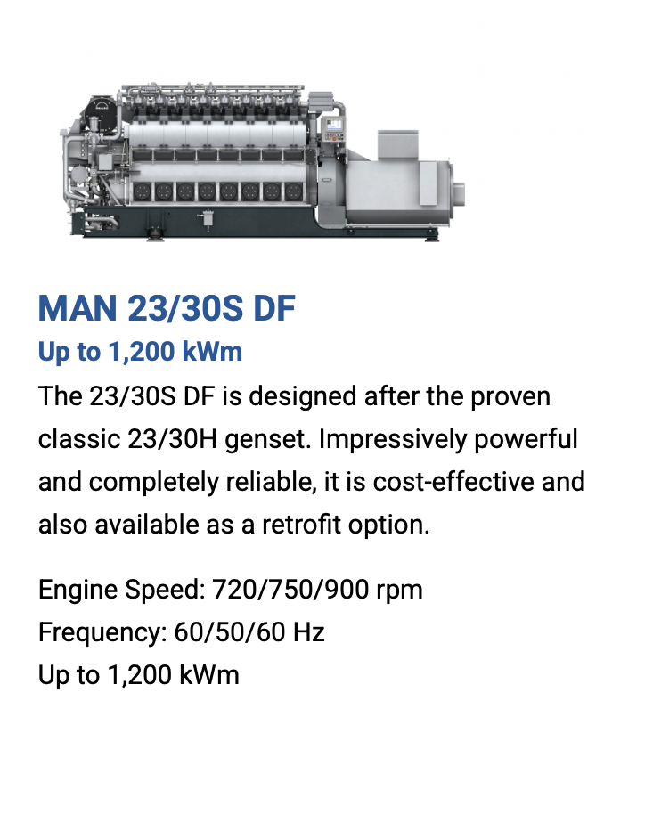 The MAN 51/60DF engines are designed for high reliability and exceptional performance in stationary power generation. They are optimized for high ambient temperatures and altitude making them ideal for a wide range of applications. These versatile engines support different fuel variants, allowing flexible operation according to specific needs. If one of the liquid fuel engines has already been purchased, it’s easy to upgrade them to dual fuel capability to meet changing needs. They offer the ability to start and stop in gas mode, increasing operating efficiency. Available in high efficiency and high power versions, the MAN 51/60DF engines ensure optimum performance in a wide range of applications. The engines are designed to be clean and their flexibility is further demonstrated by their full stand-by capability in both gas and liquid fuel operation.