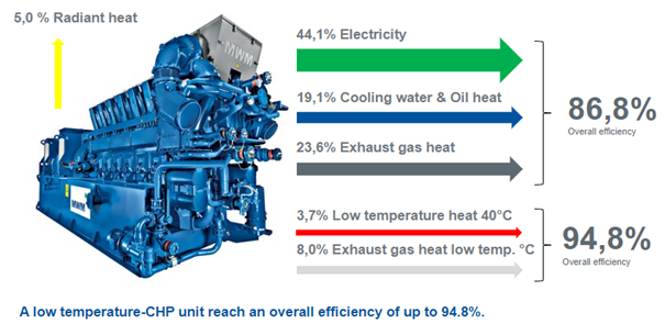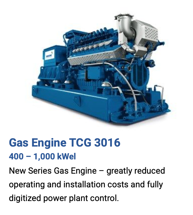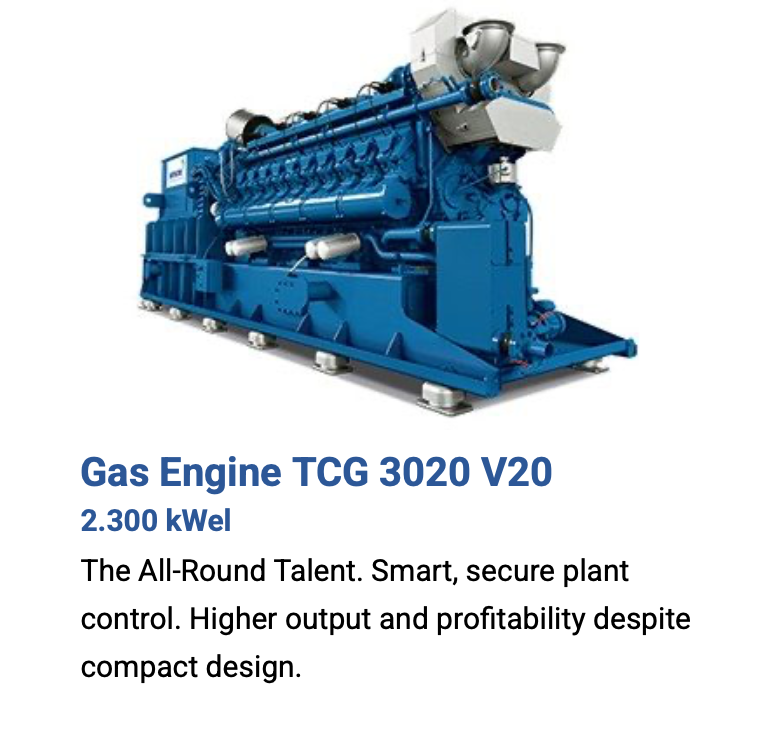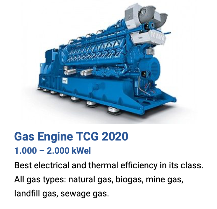 The gas engines can be operated with various types of gas, such as natural gas, shale gas, mine gas, biogas, landfill gas, sewage gas, and syngas. They are designed for maximum electrical and thermal efficiency, low operating and service costs, and high reliability and availability. Thus they achieve efficiency of over 90 percent.