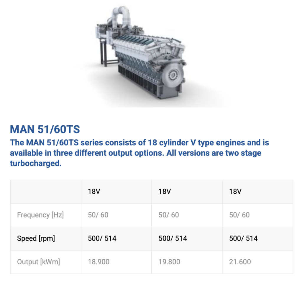 The MAN 51/60 and 51/60TS engines are designed to deliver exceptional performance and reliability for stationary power generation. They are optimized for high ambient temperatures and altitude, making them ideal for a wide range of applications. Additionally, the engines are capable of running on MDO, MGO, HFO and various biofuels, providing high versatility in fuel choice and making them future proof. Both series offer excellent fuel efficiency, ensuring cost effective operation. The engines can be easily converted to dual-fuel (DF) and gas operation, offering high flexibility. While they meet all emissions requirements alone or with additional technologies, exhaust gas after treatment technologies are also offered to make them even cleaner. Designed for extended maintenance intervals, they reduce downtime and operating costs.